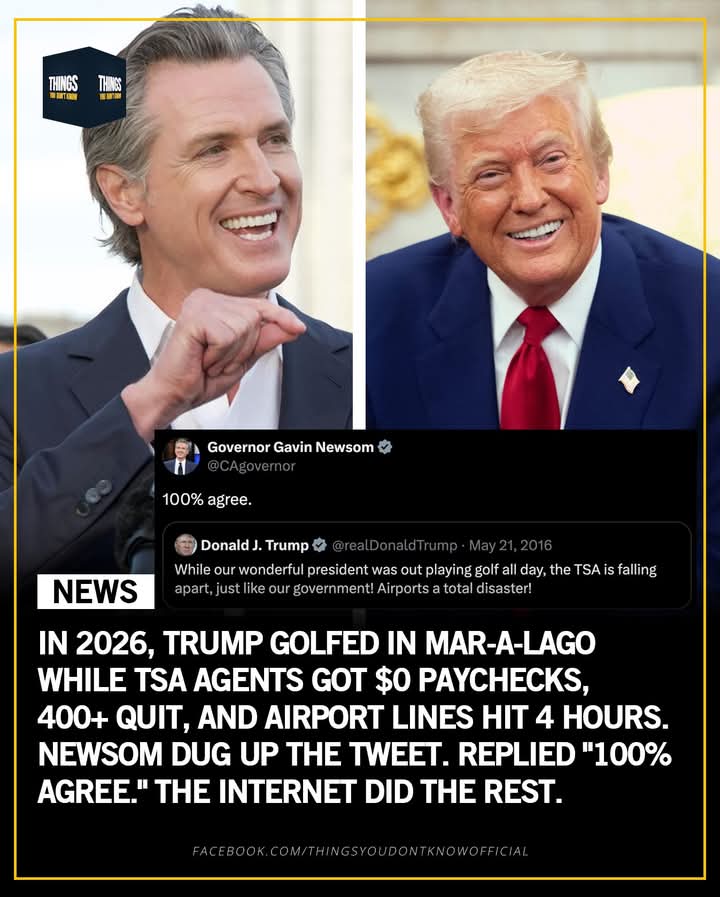 California Governor Gavin Newsom quote-tweeted a 2016 post from Donald Trump that now reads like a description of his own presidency. On May 21, 2016, Trump wrote: “While our wonderful president was out playing golf all day, the TSA is falling apart, just like our government! Airports a total disaster!” Newsom’s response on March 23, 2026: “100% agree.”